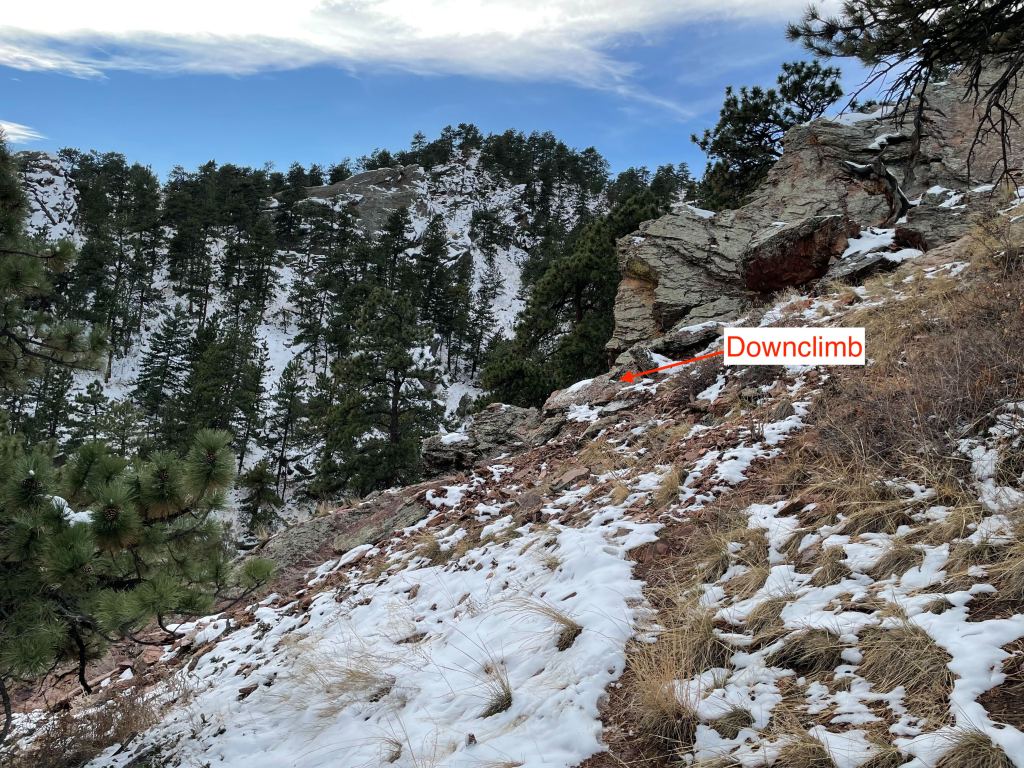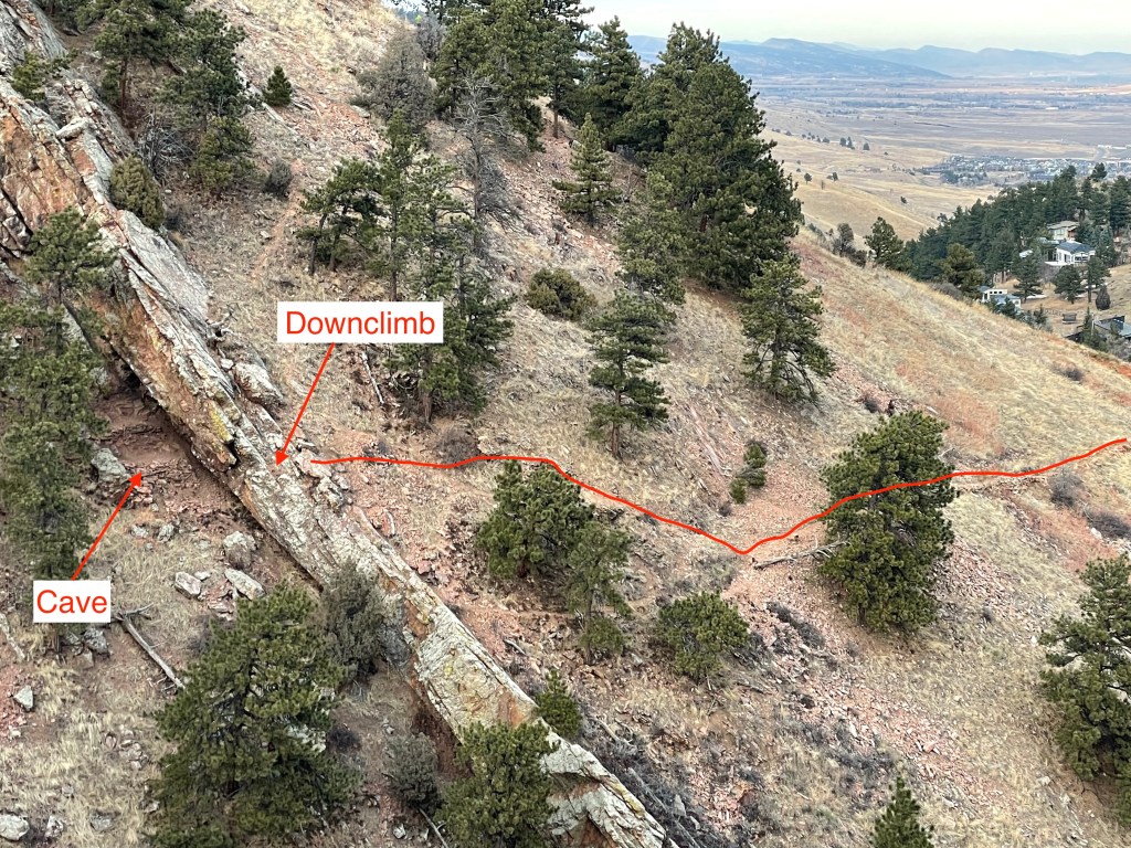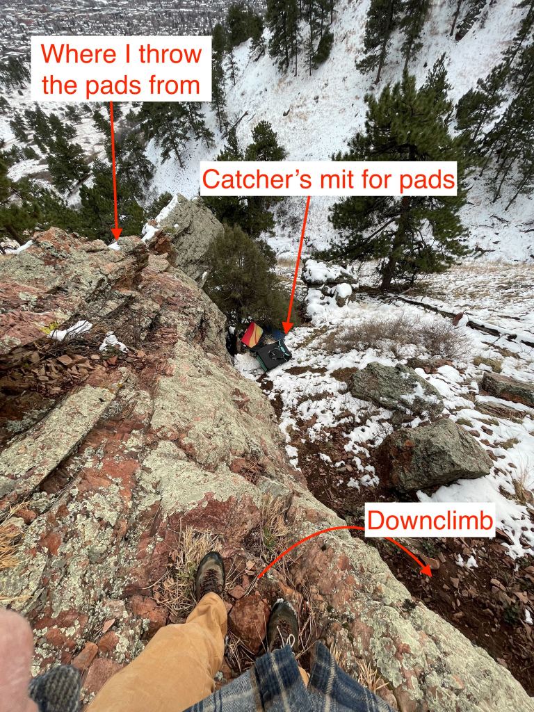 Here are pictures on where the down climb is and where to throw pads when going to the cave: