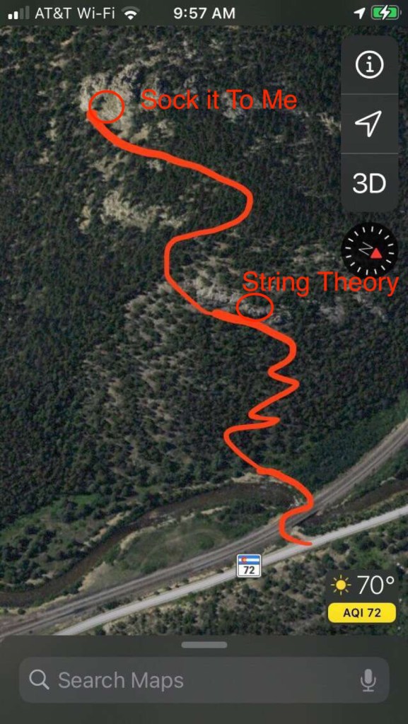 The parking is here passed the parking for the Mandelorian/Trax on the left next to a bridge. Once parked, walk across bridge to other side of creek. Then, walk straight up the hill toward an obvious cliff which is the problem String Theory v12. To get to Sock it To Me v12, stay under the cliff and go up and climber’s left toward the pin.